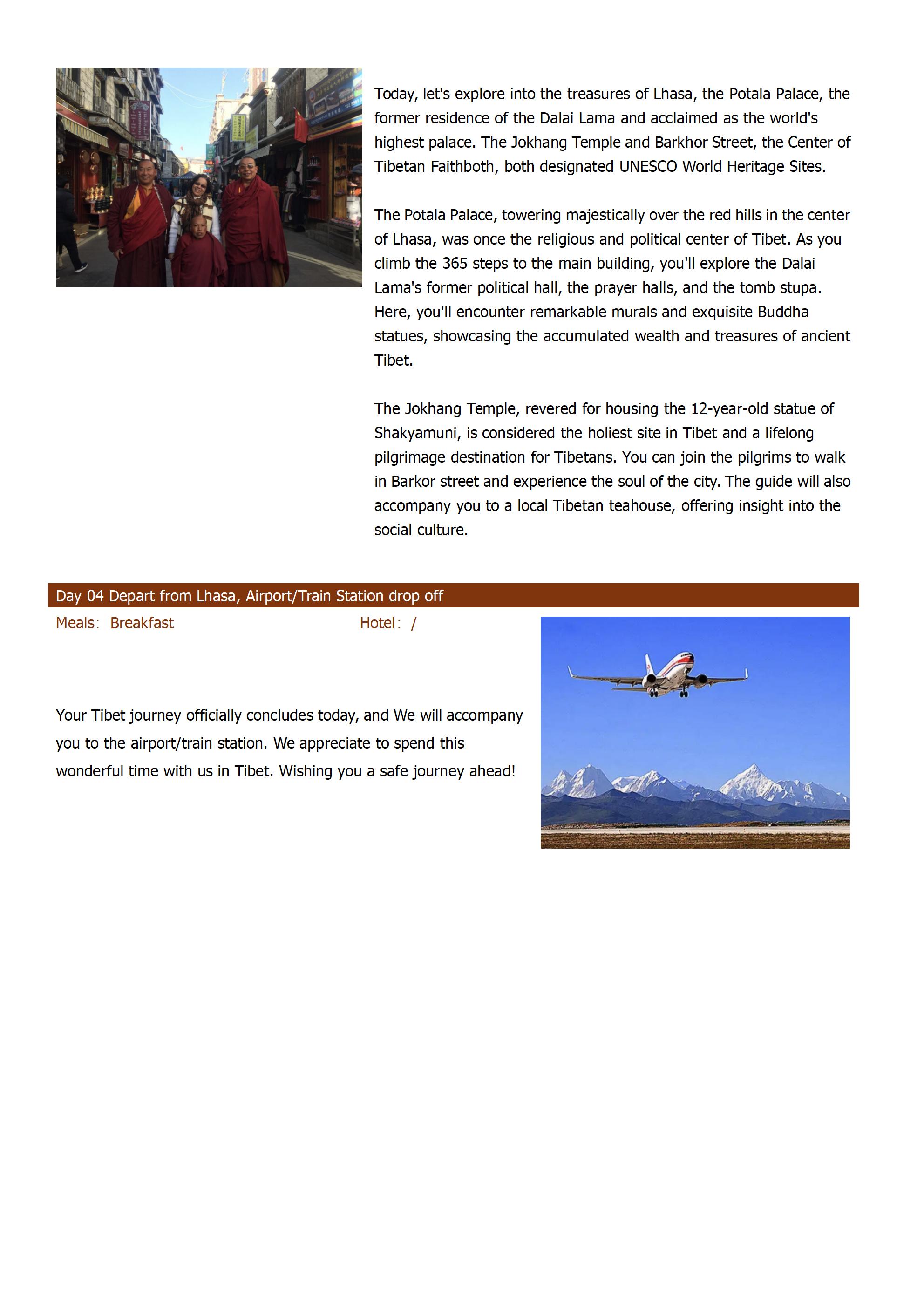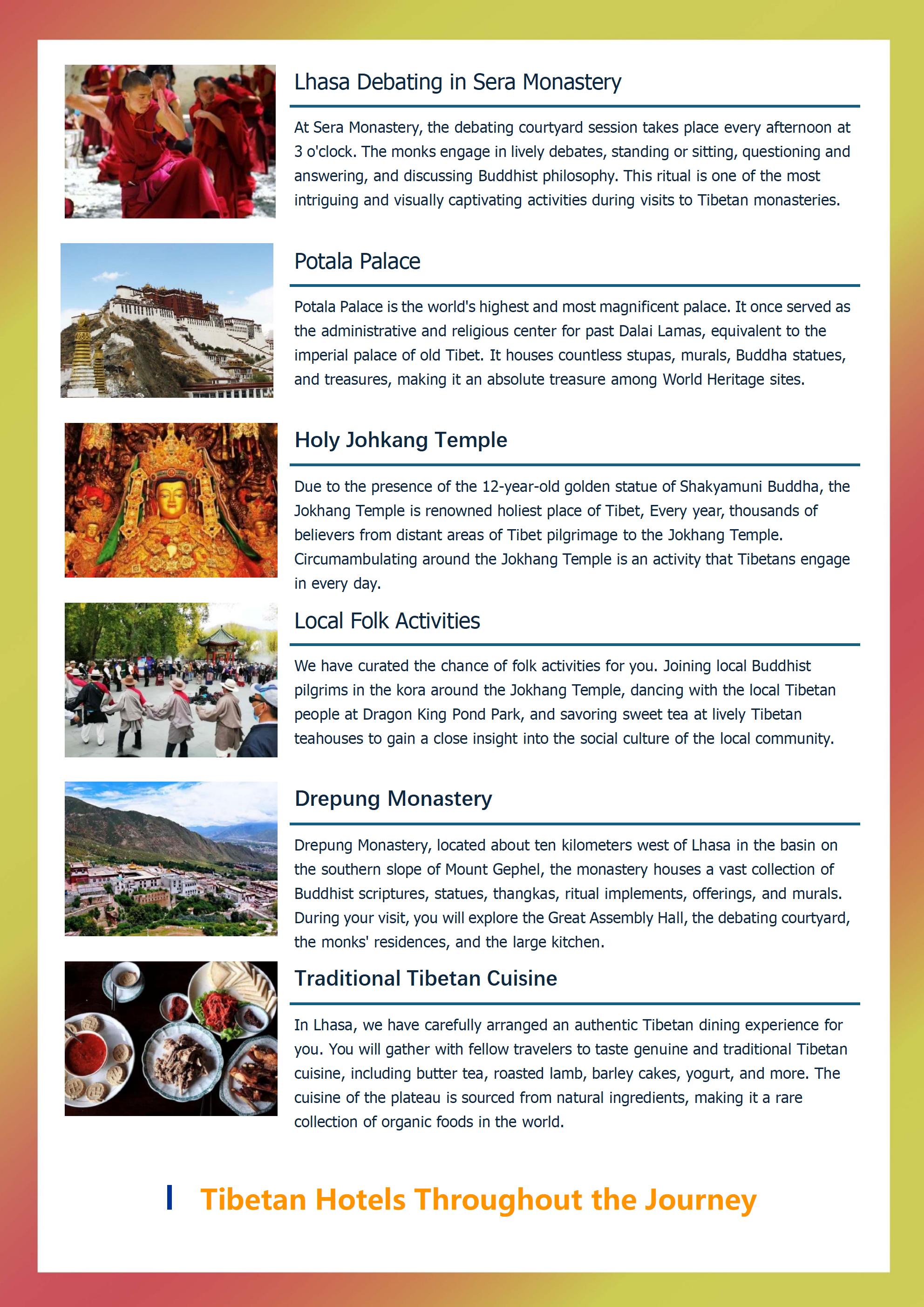 Welcome to the world's highest capital city - the holy Buddhist city of Lhasa. Throughout history, Lhasa has attracted the most astute merchants, wise politicians, and devout Buddhist believers from across the Tibetan region, making it the most prosperous city in the Tibetan economy and imbued with the richest Tibetan Buddhist cultural atmosphere. In just a few days in Lhasa, we will accompany you to visit the world's highest and grandest palace, the Potala Palace, the holiest Jokhang Temple, and Barkhor Street, the largest monastery, Drepung Monastery, and witness the most spectacular and ceremonial monk debates.