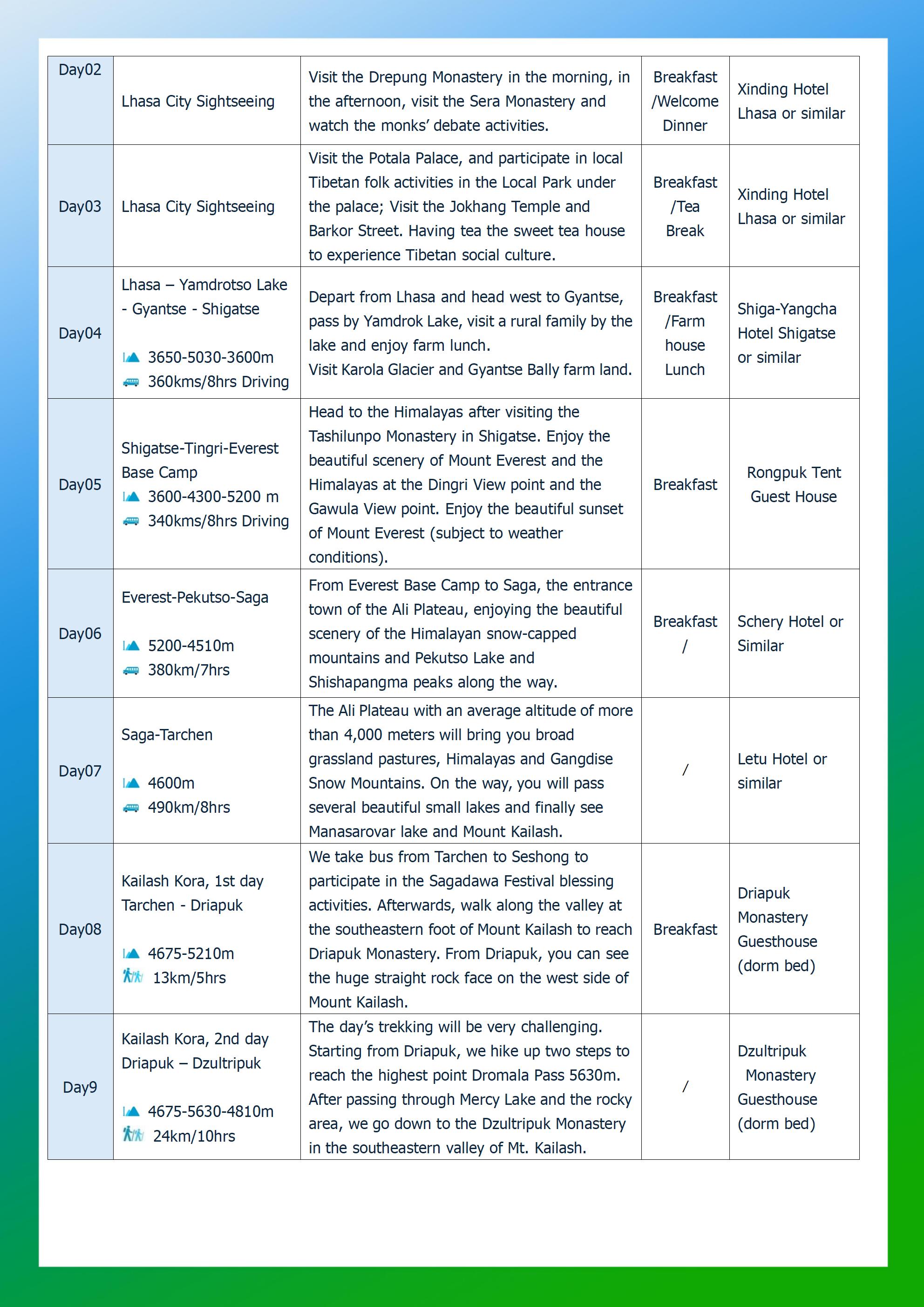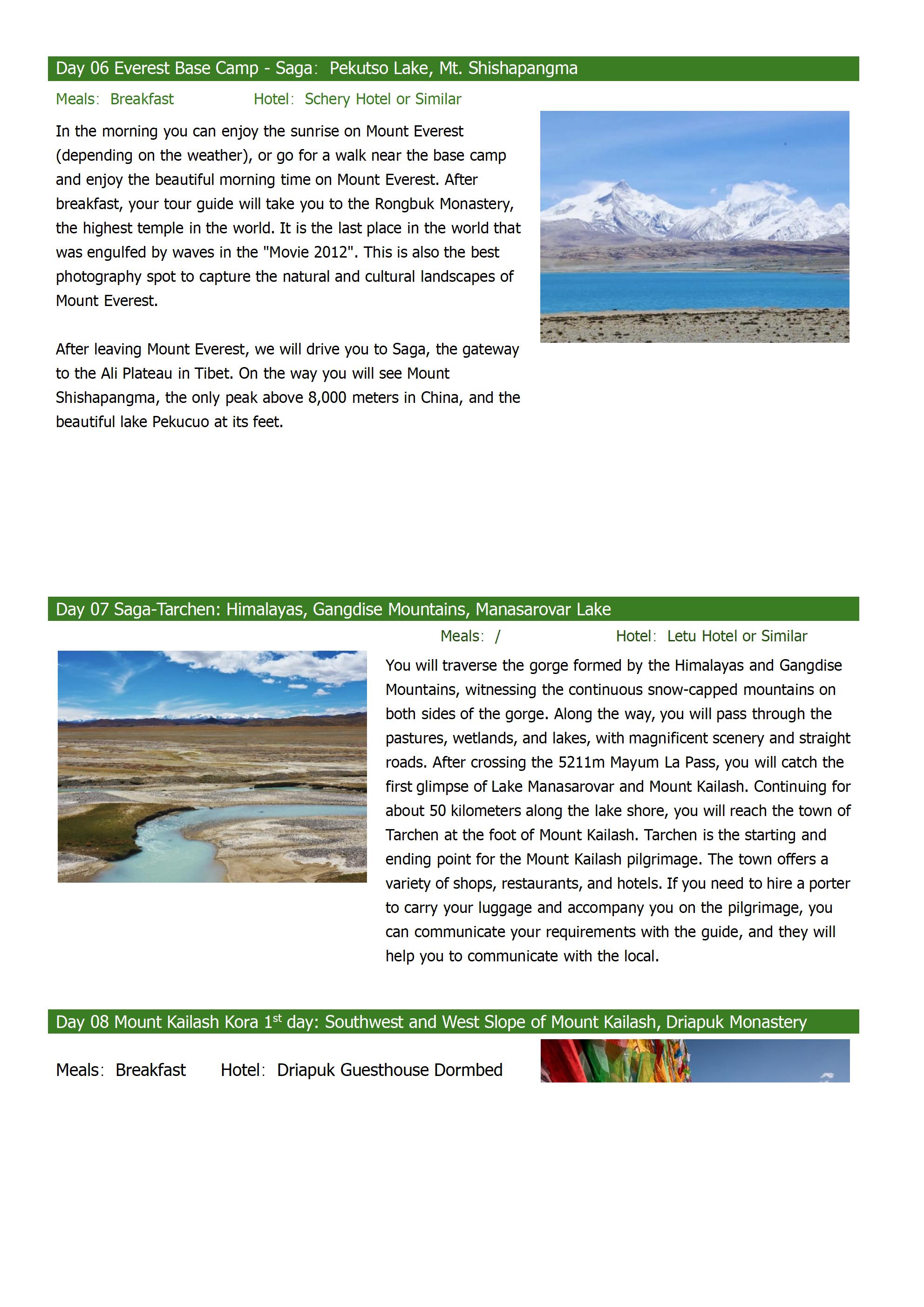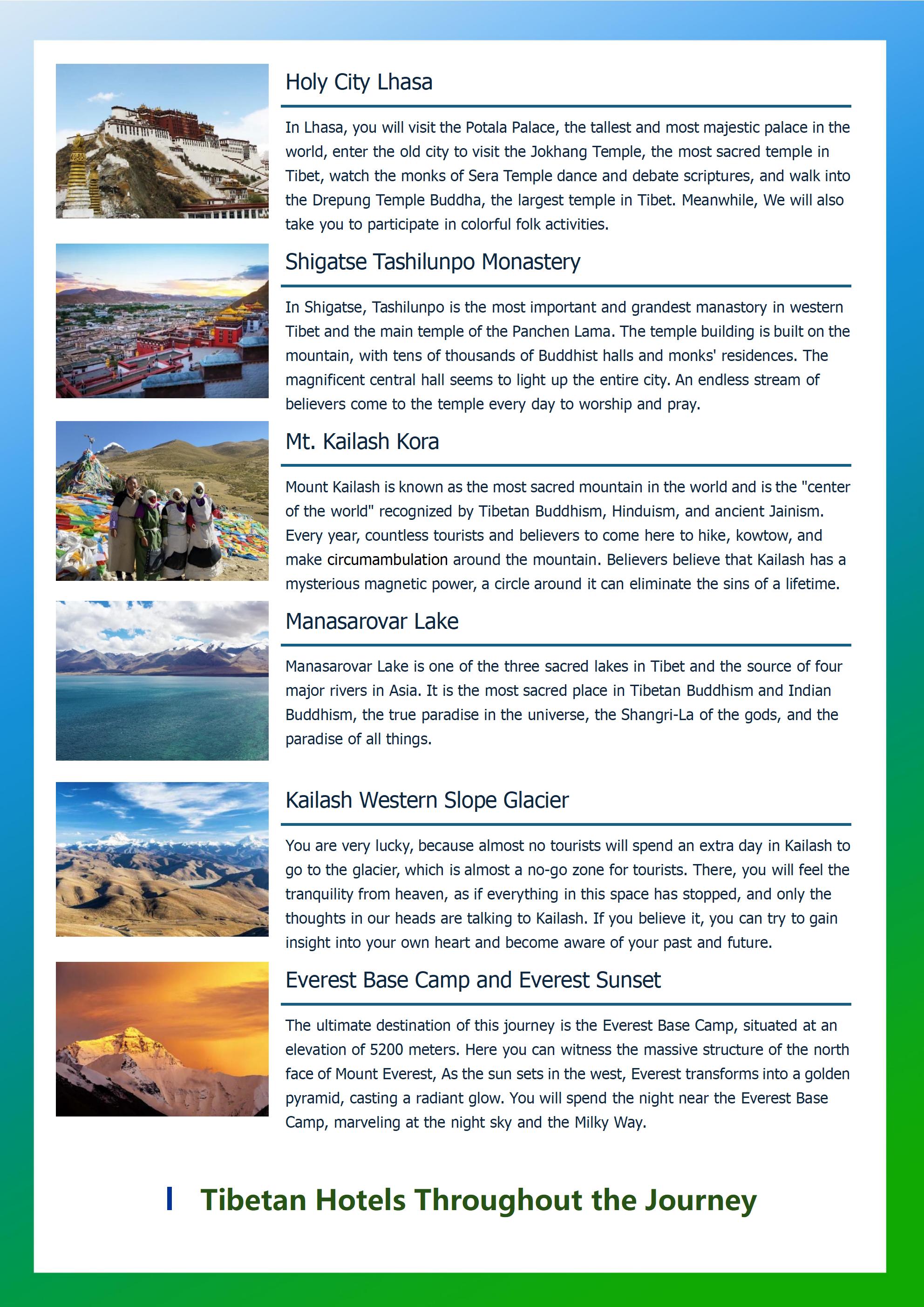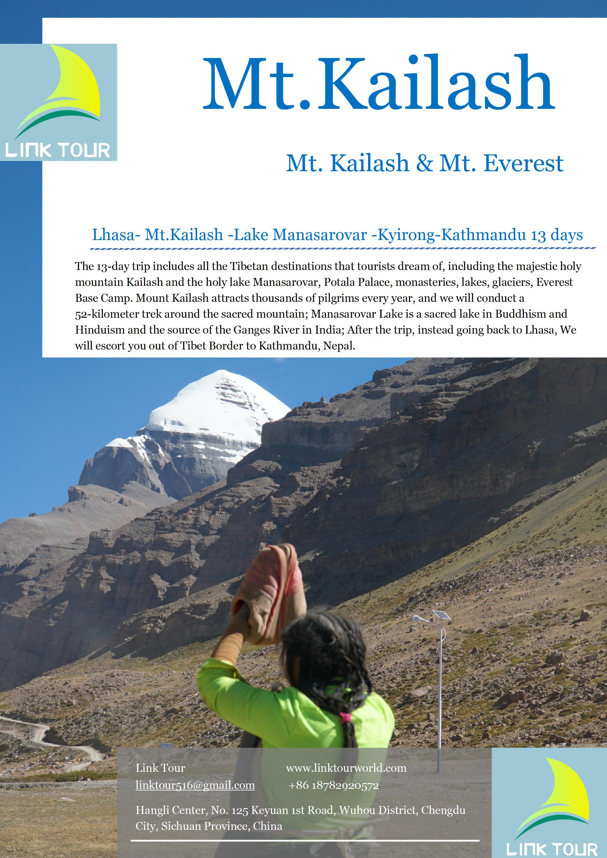 The 13-day trip includes all the Tibetan destinations that tourists dream of, including the majestic holy mountain Kailash and the holy lake Manasarovar, Potala Palace, monasteries, lakes, glaciers, Everest Base Camp. Mount Kailash attracts thousands of pilgrims every year, and we will conduct a 52-kilometer trek around the sacred mountain; Manasarovar Lake is a sacred lake in Buddhism and Hinduism and the source of the Ganges River in India; After the trip, instead going back to Lhasa, We will escort you out of Tibet Border to Kathmandu, Nepal.