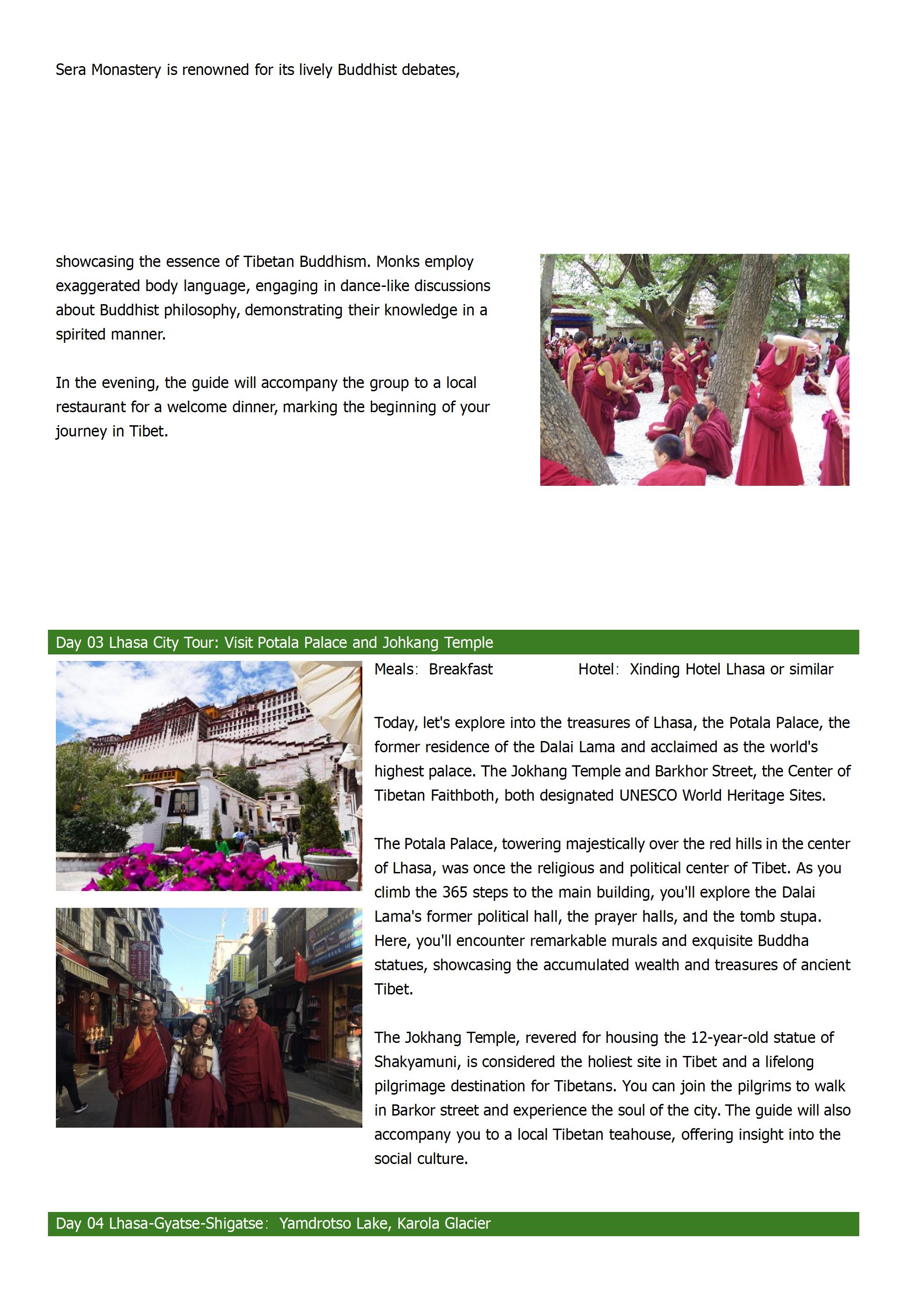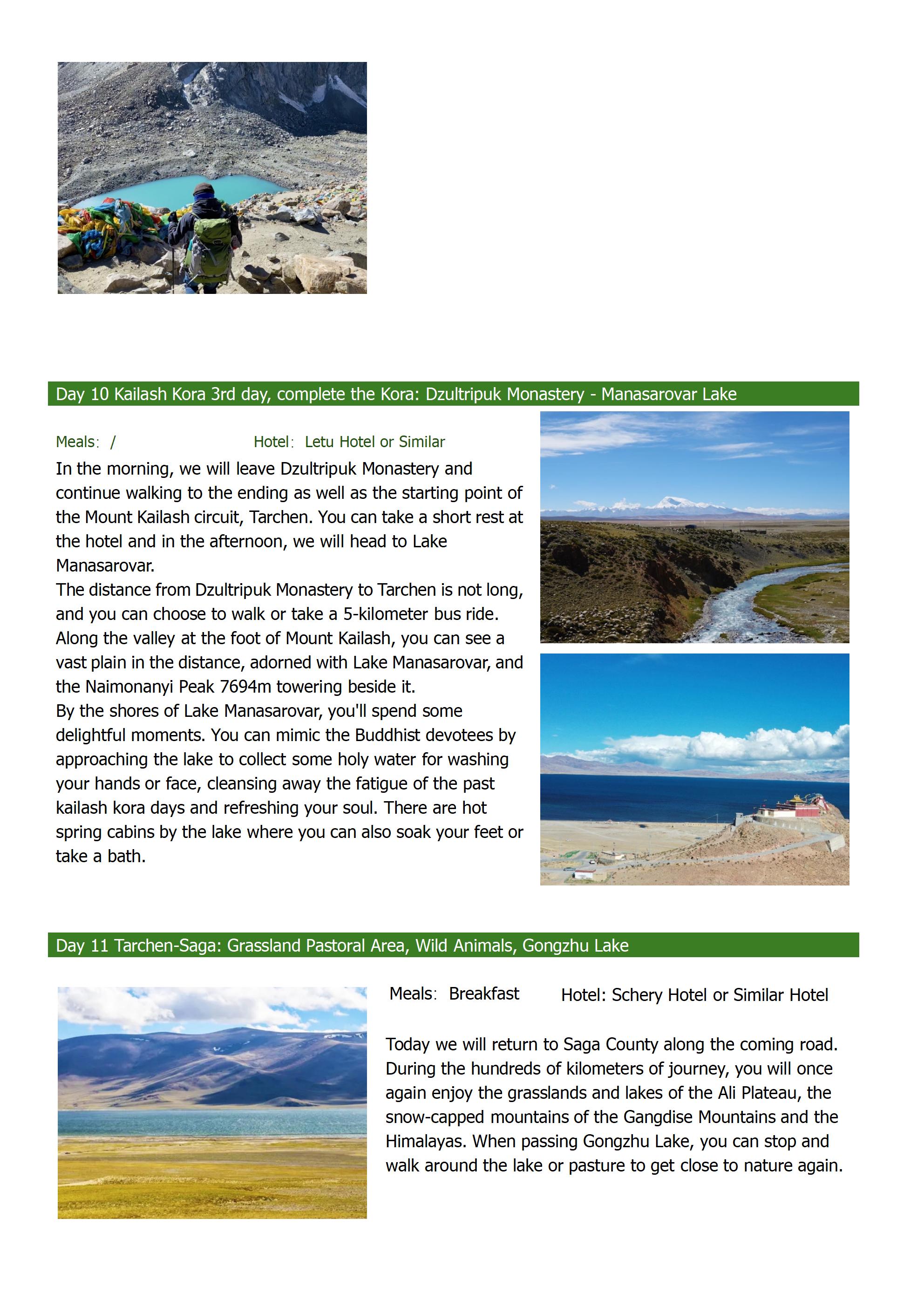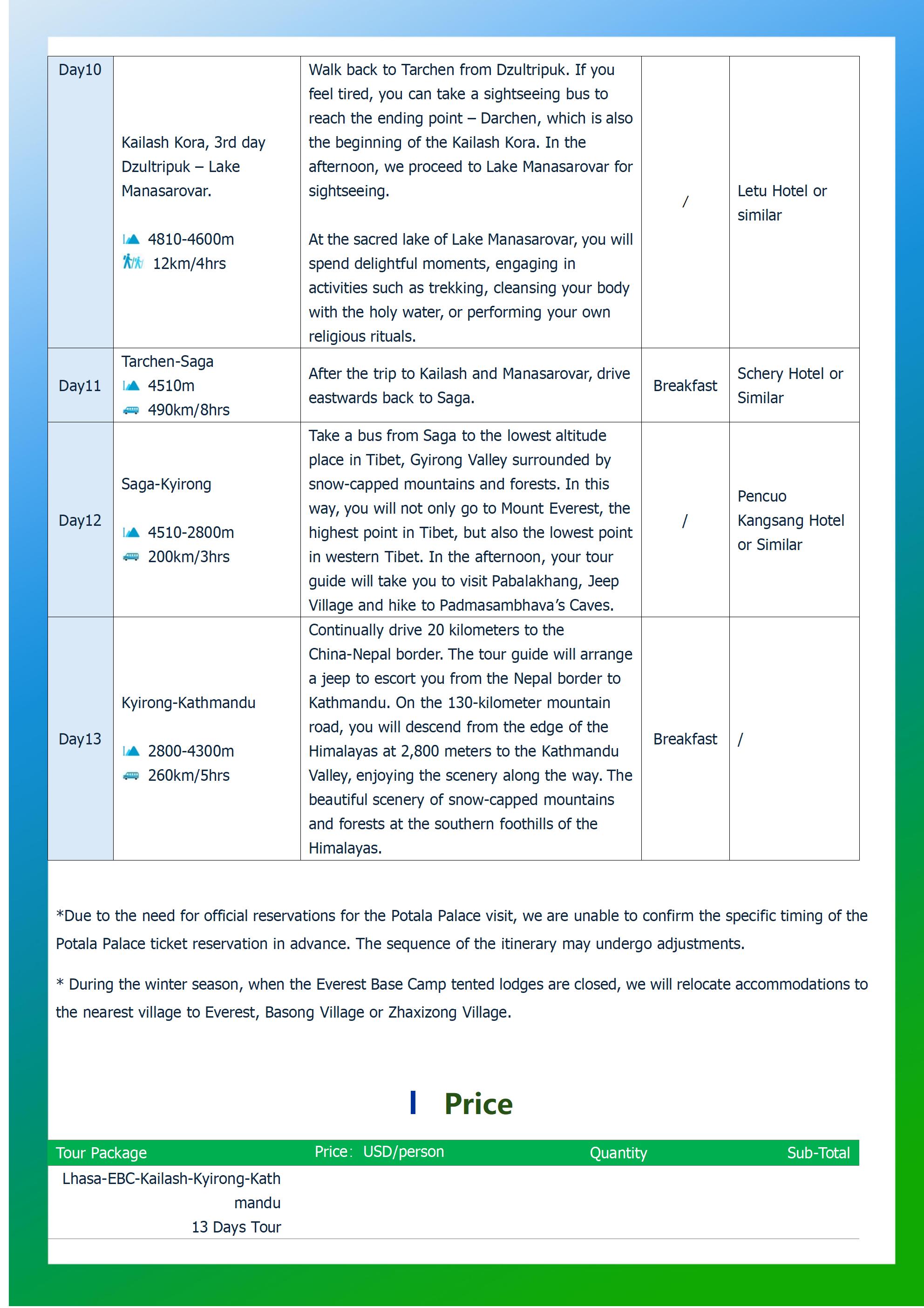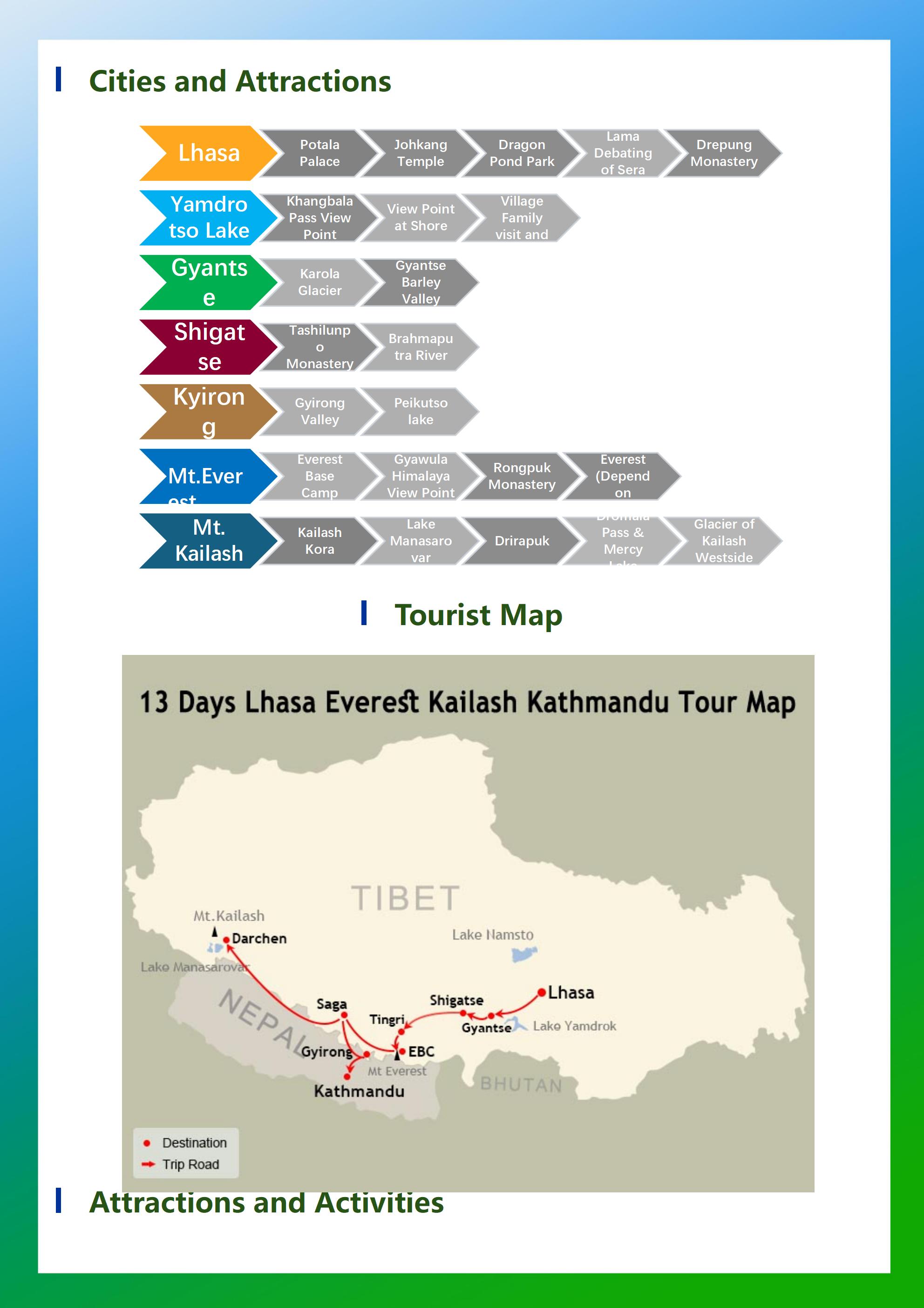 The 13-day trip includes all the Tibetan destinations that tourists dream of, including the majestic holy mountain Kailash and the holy lake Manasarovar, Potala Palace, monasteries, lakes, glaciers, Everest Base Camp. Mount Kailash attracts thousands of pilgrims every year, and we will conduct a 52-kilometer trek around the sacred mountain; Manasarovar Lake is a sacred lake in Buddhism and Hinduism and the source of the Ganges River in India; After the trip, instead going back to Lhasa, We will escort you out of Tibet Border to Kathmandu, Nepal.